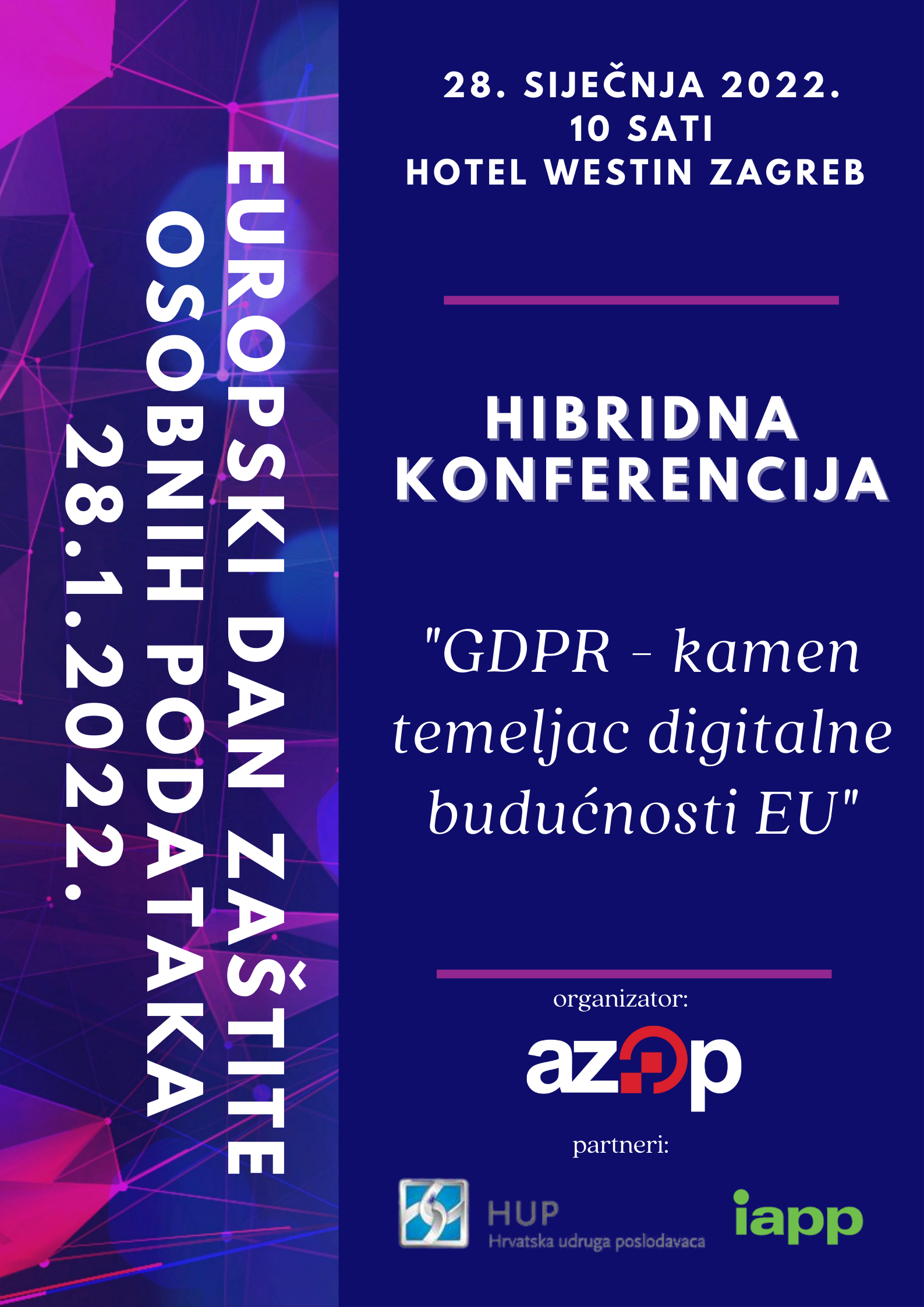 To mark this special day, together with Croatian Employers’ Association and IAPP KnowledgeNet Croatia, AZOP is organising a high-level conference in a hybrid format titled GDPR- the cornerstone of the EU digital future.