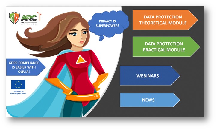 Internetski alat Olivia sadržavat će edukativne materijale razvijene u okviru projekta ARC I: https://arc-rec-project.eu/education/, https://arc-rec-project.eu/edukativni-materijali/, T4DATA projekt https://azop.hr/t4data/ i projekta zaštite podataka MSP-a https://smedata.eu/index.php/it/. Nadalje, razvit će se novi sadržaj posebno prilagođen hrvatskim potrebama i potrebama malih i srednjih poduzeća. Alat Olivia sadržavat će zapise o internetskim radionicama za mala i srednja poduzeća te evidenciju radionica za instruktore koje provode AZOP i GPDP.